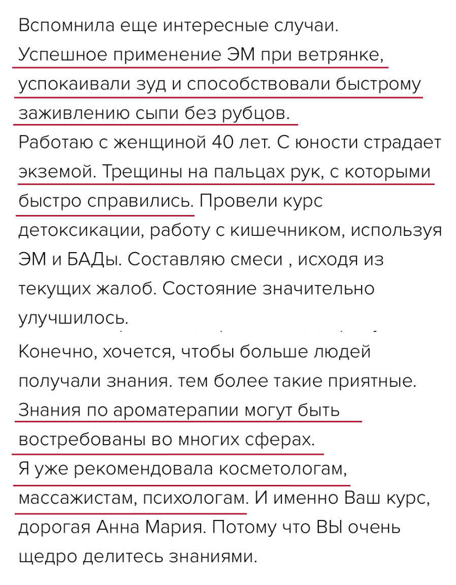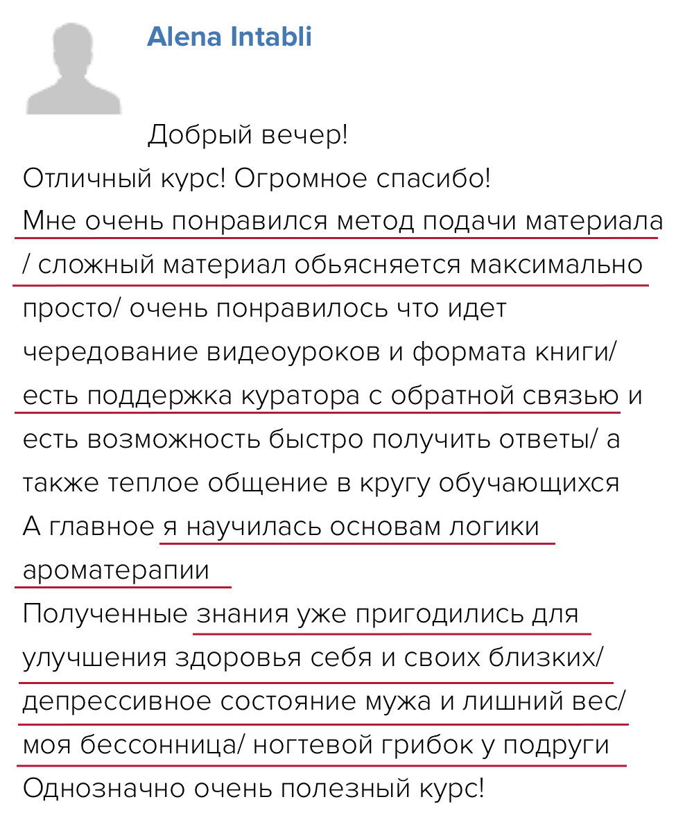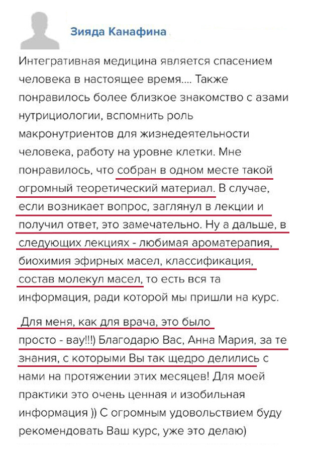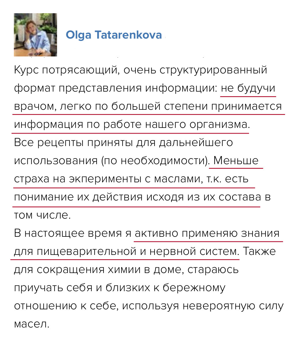 Программа курса построена так, чтобы вы шаг за шагом все освоили и начали практиковать с поддержкой. Анна Мария проверяет все домашние задания, у вас есть группа поддержки и возможность задавать вопросы. Вы получите много бонусных материалов и подарков – чек-листы, протоколы, вебинары, электронные книги и доступ в Арома-Нутри Клуб, чтобы поддерживать знания и после курса. Вы точно справитесь!