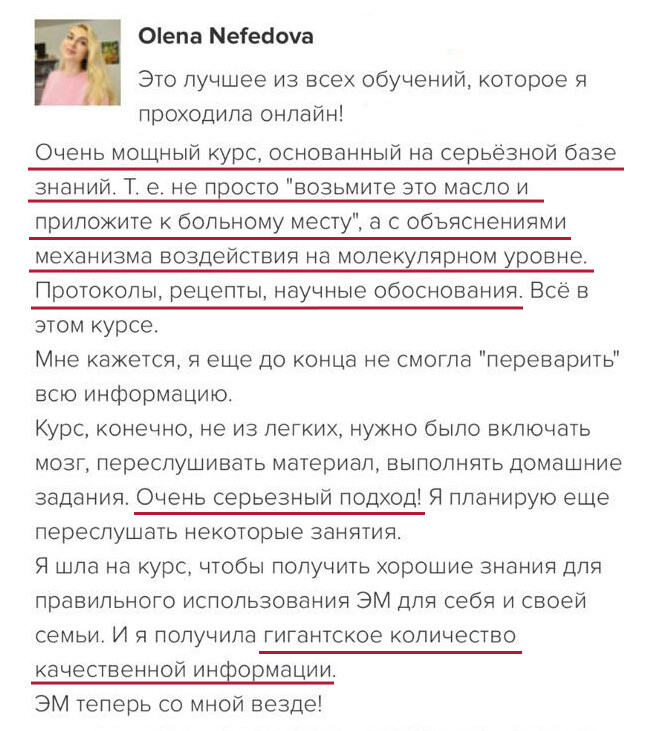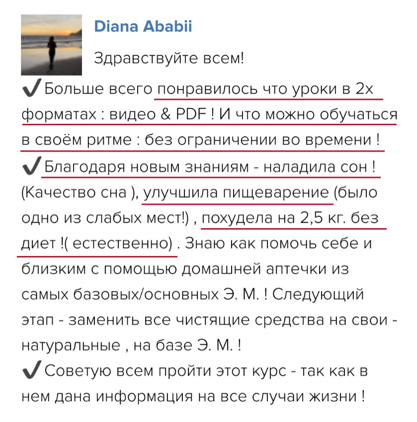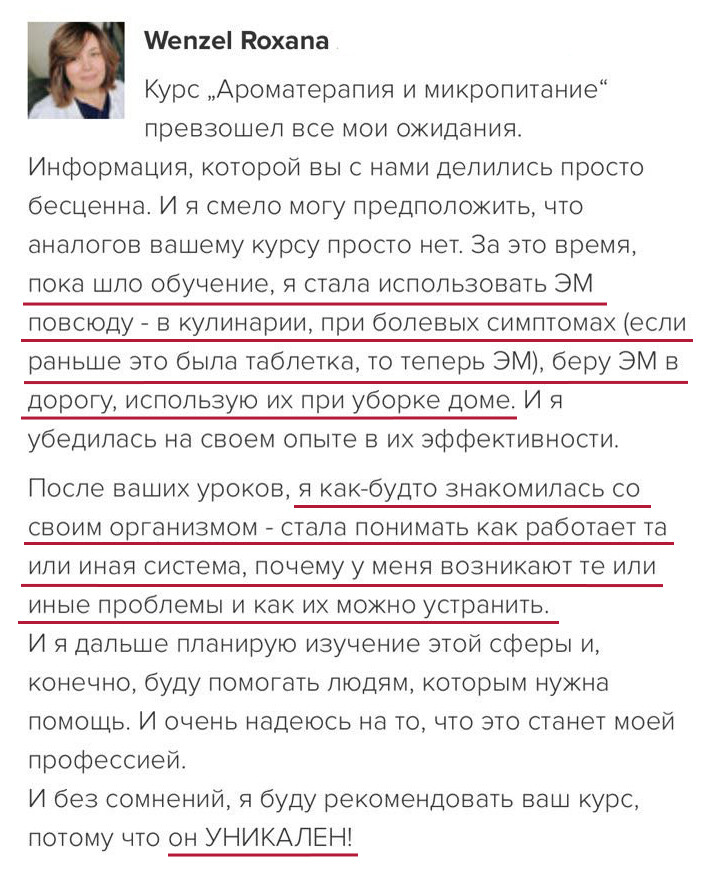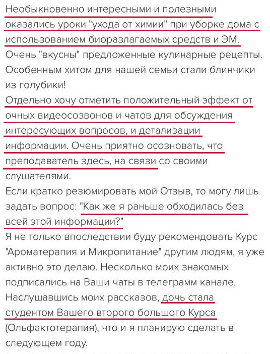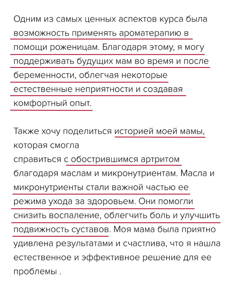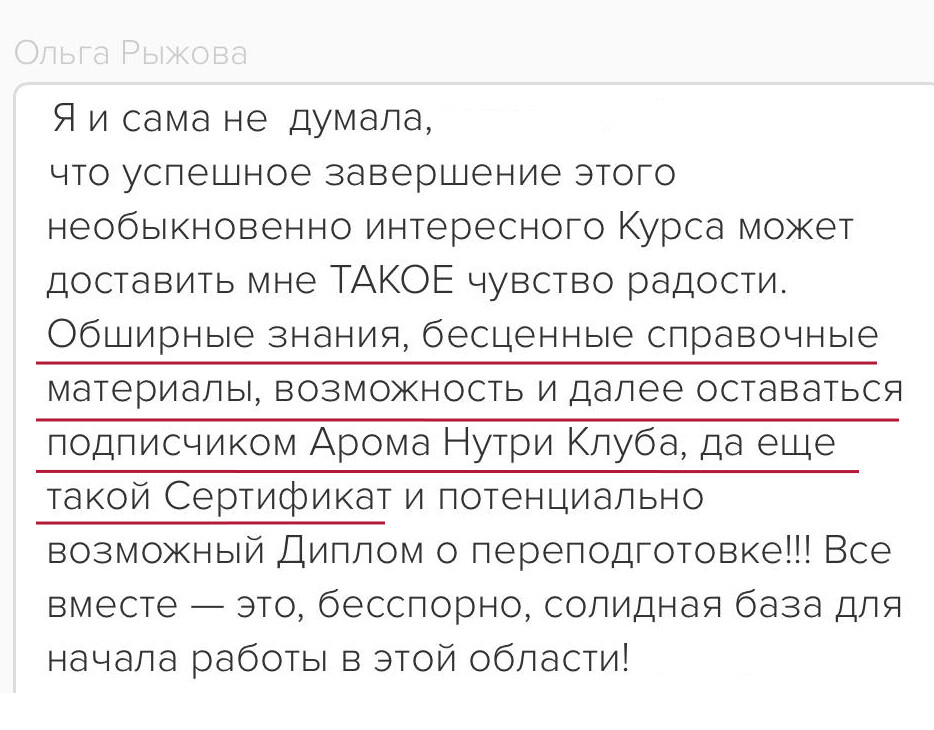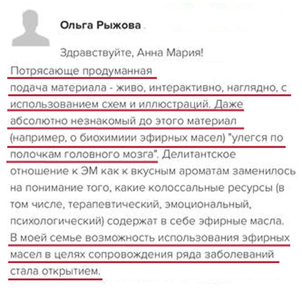 Программа курса построена так, чтобы вы шаг за шагом все освоили и начали практиковать с поддержкой. Анна Мария проверяет все домашние задания, у вас есть группа поддержки и возможность задавать вопросы. Вы получите много бонусных материалов и подарков – чек-листы, протоколы, вебинары, электронные книги и доступ в Арома-Нутри Клуб, чтобы поддерживать знания и после курса. Вы точно справитесь!